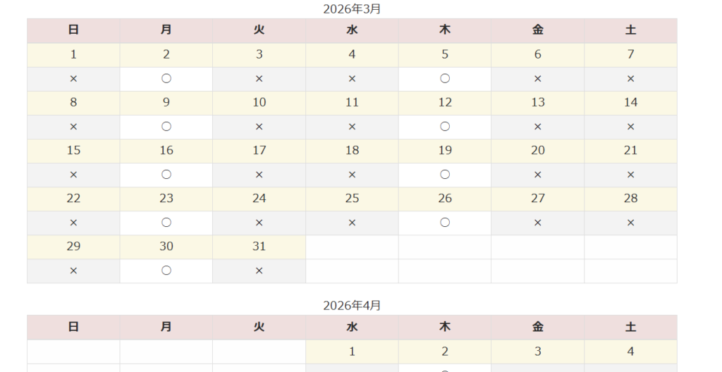 基本は ○=予約できる/×=予約できない(空きなし) の目印なので、○の日から希望日を選びます。