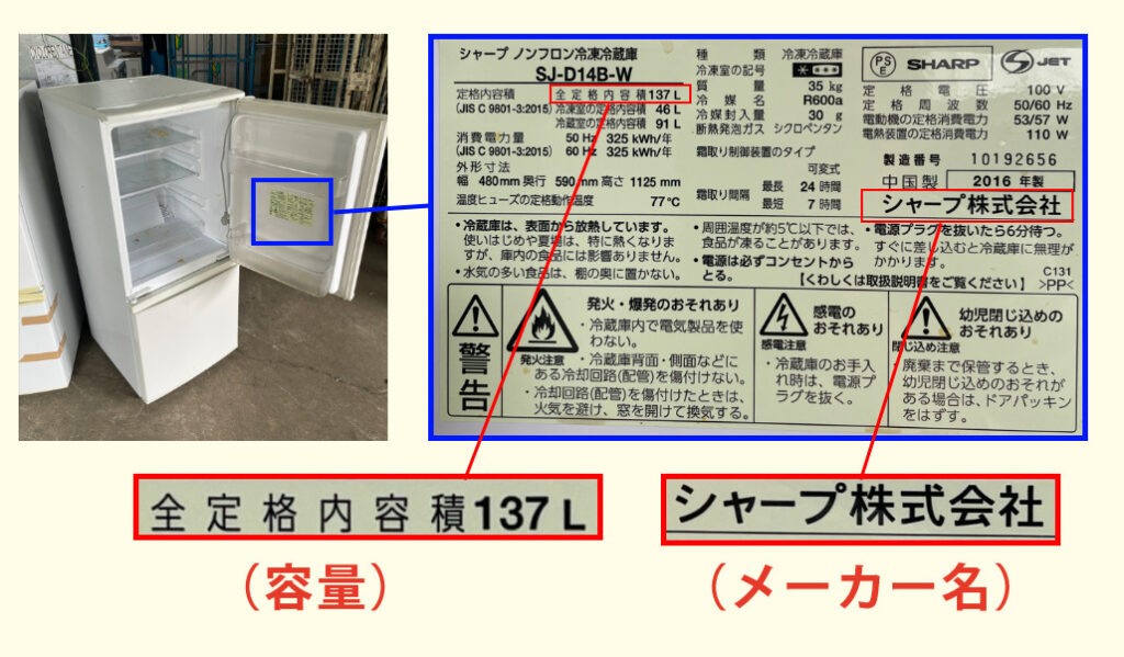 写真の例の場合、容量137Lのため、容量170L以下の「容量(小)」に分類されます。