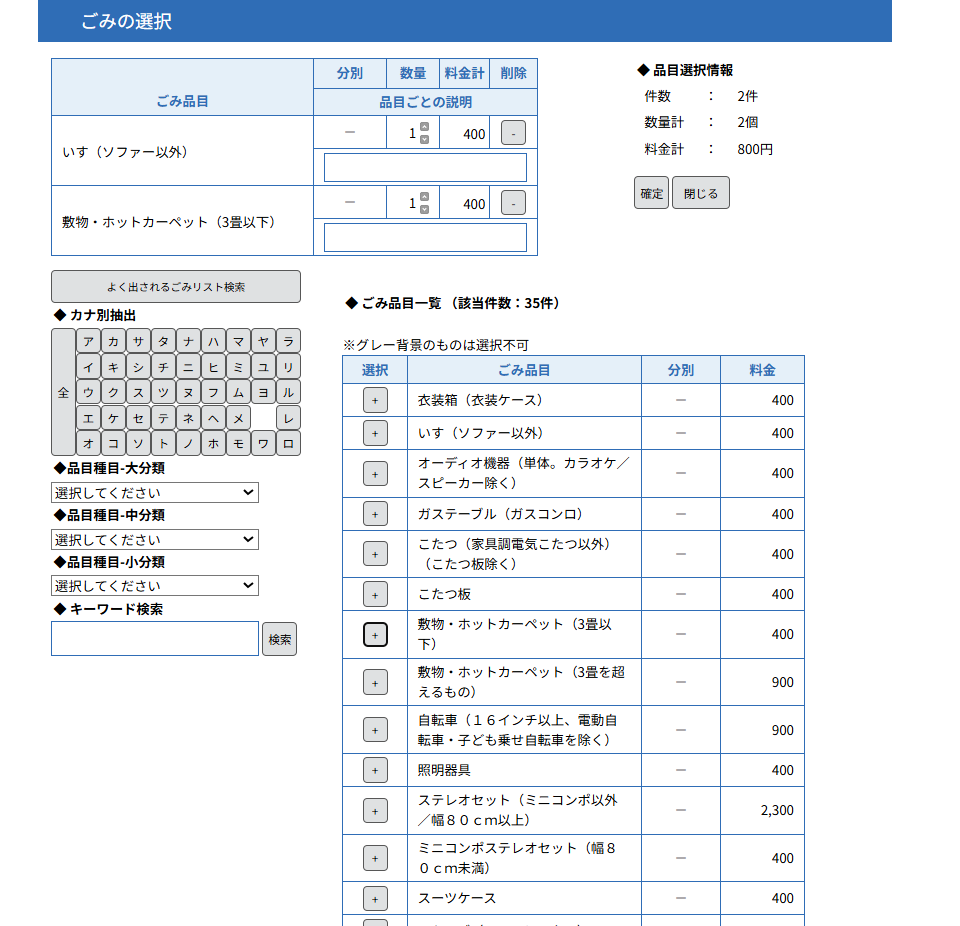 品目は、よく出されるごみリスト・カナ検索・キーワード検索などで探して追加します。